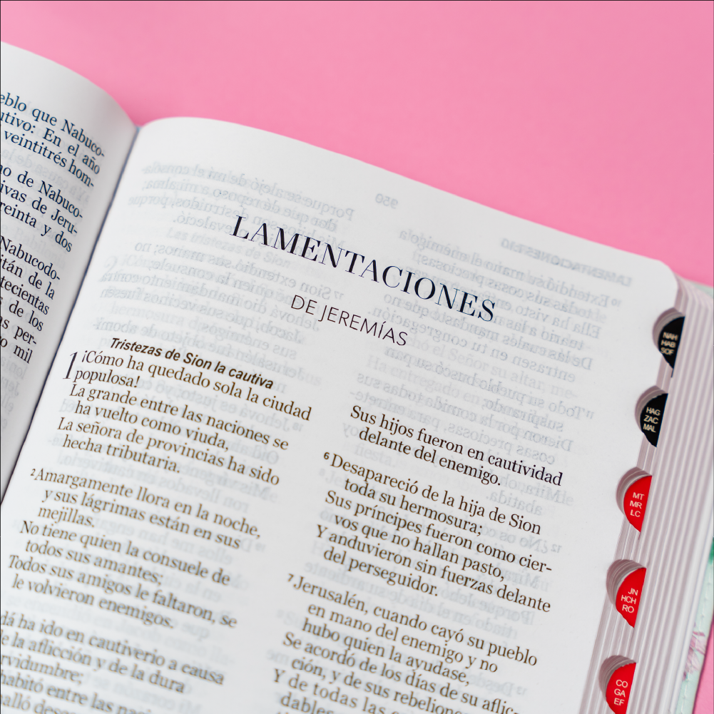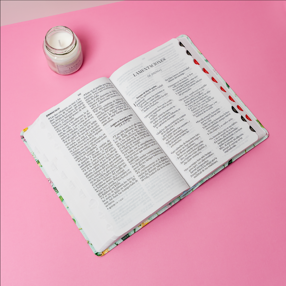 Biblia con pestañas de búsqueda en una edición especialmente diseñada para facilitar la navegación rápida y eficiente entre los libros del Antiguo y Nuevo Testamento. Identifica las palabras de Jesús en rojo, concordancia amplia de 120 páginas, concordancia de personajes bíblicos. Esta Biblia contiene adicional 32 páginas a todo color con ayudas.
